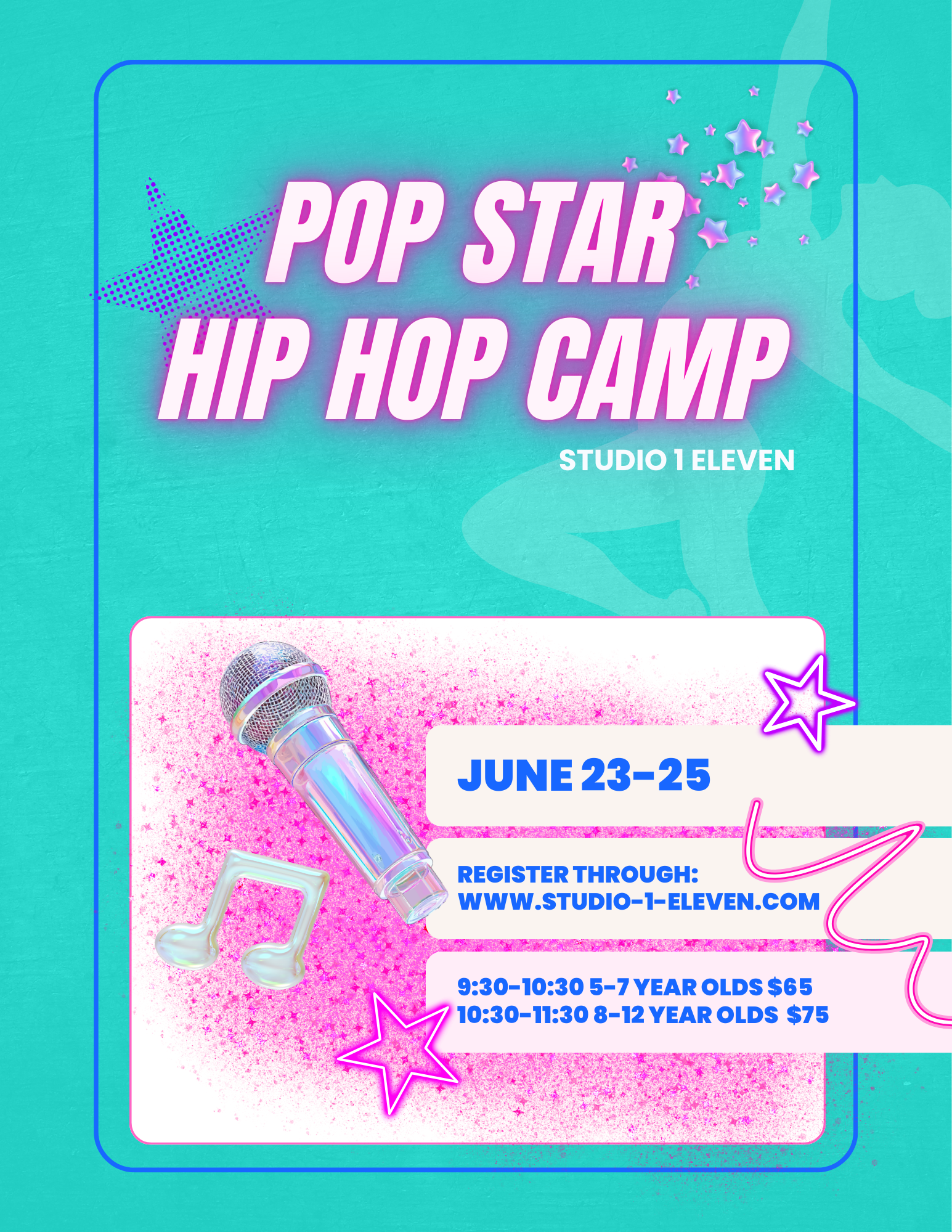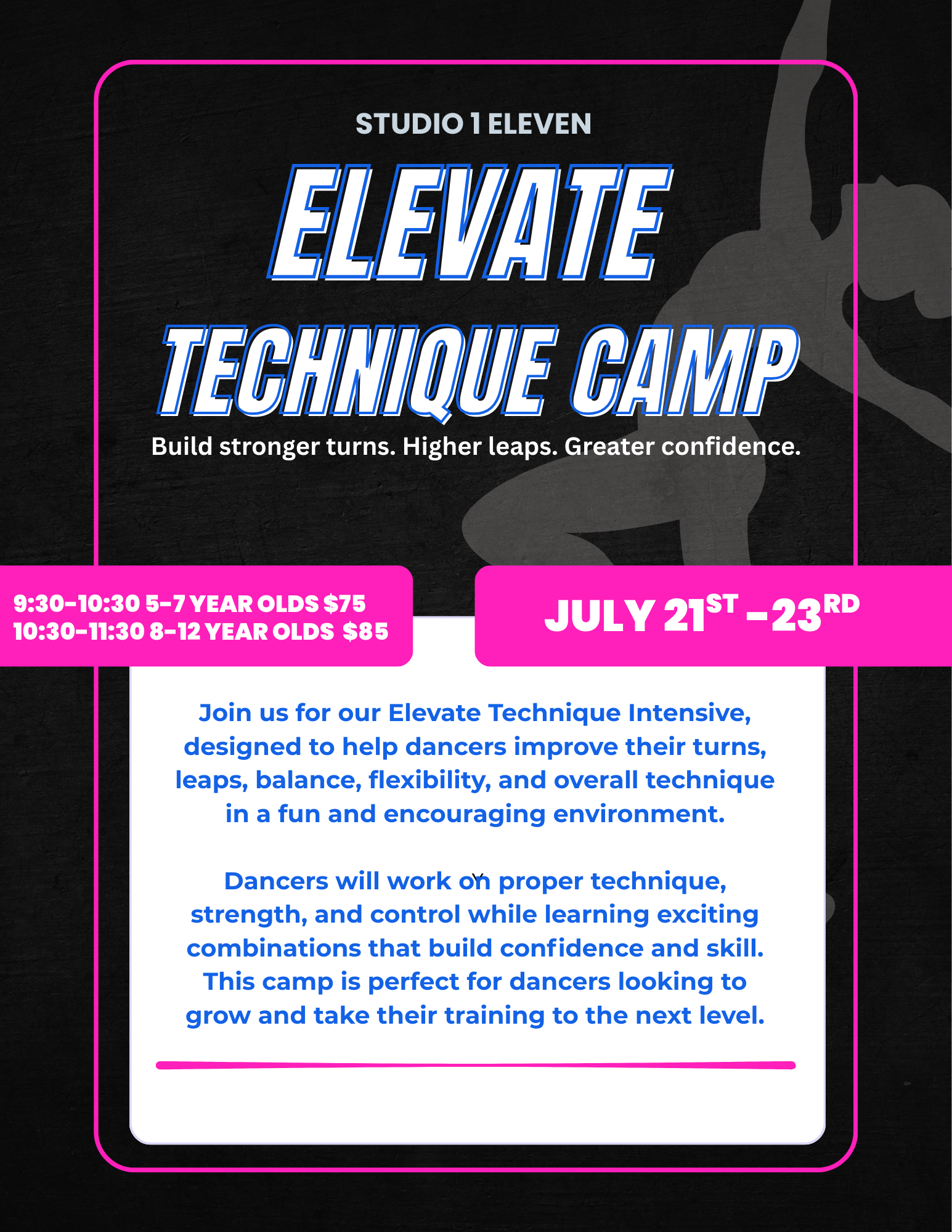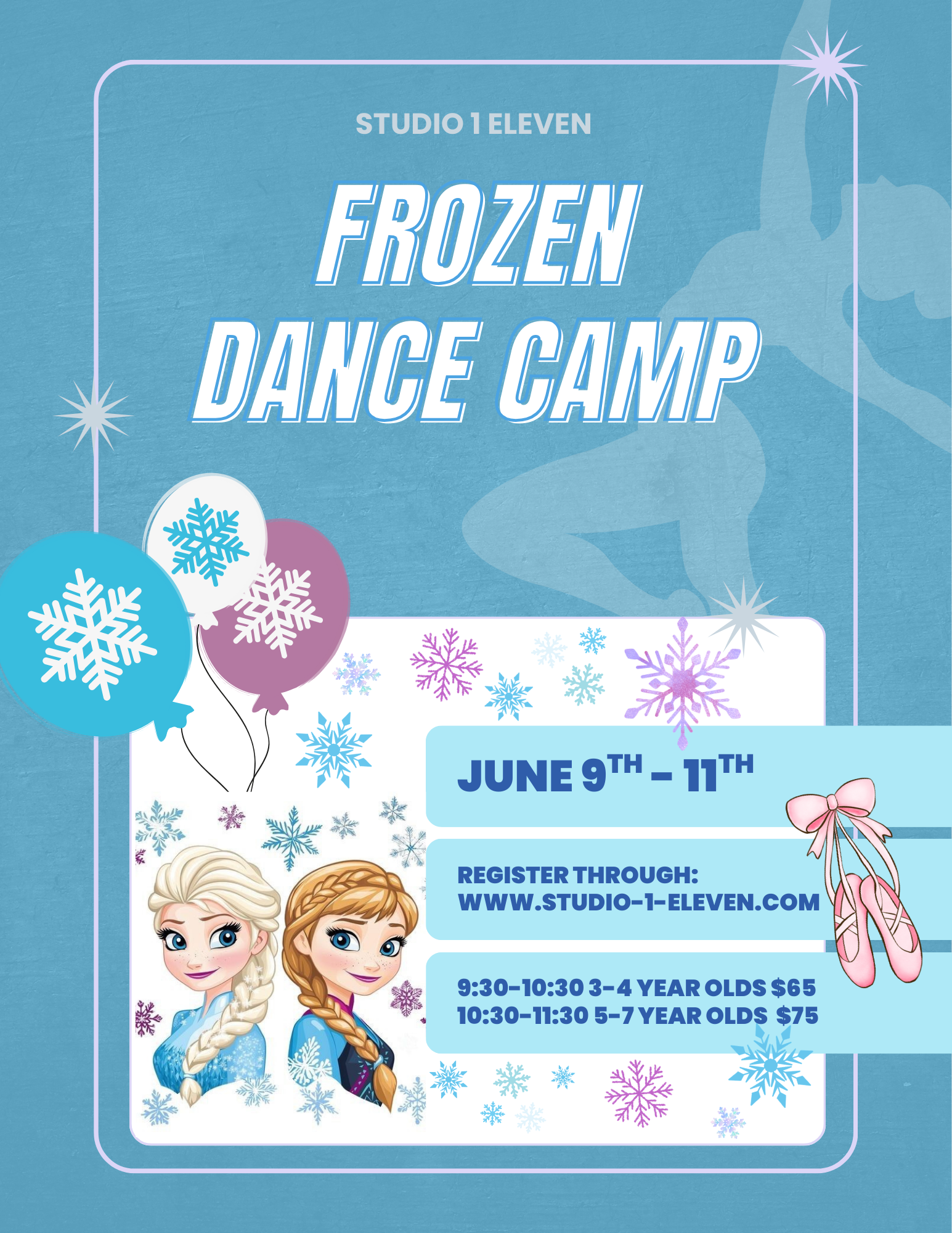 Summer at Studio 1 Eleven is full of fun, creativity, and nonstop dancing! We offer a variety of themed camps throughout the summer for ages 2-12, so there’s something to every dancer. Camp Registration is $25 and is stackable, once you pay the registration fee for one camp, it covers all summer camps. We can’t wait to welcome both our familiar faces and new dancers into the studio for an unforgettable summer!